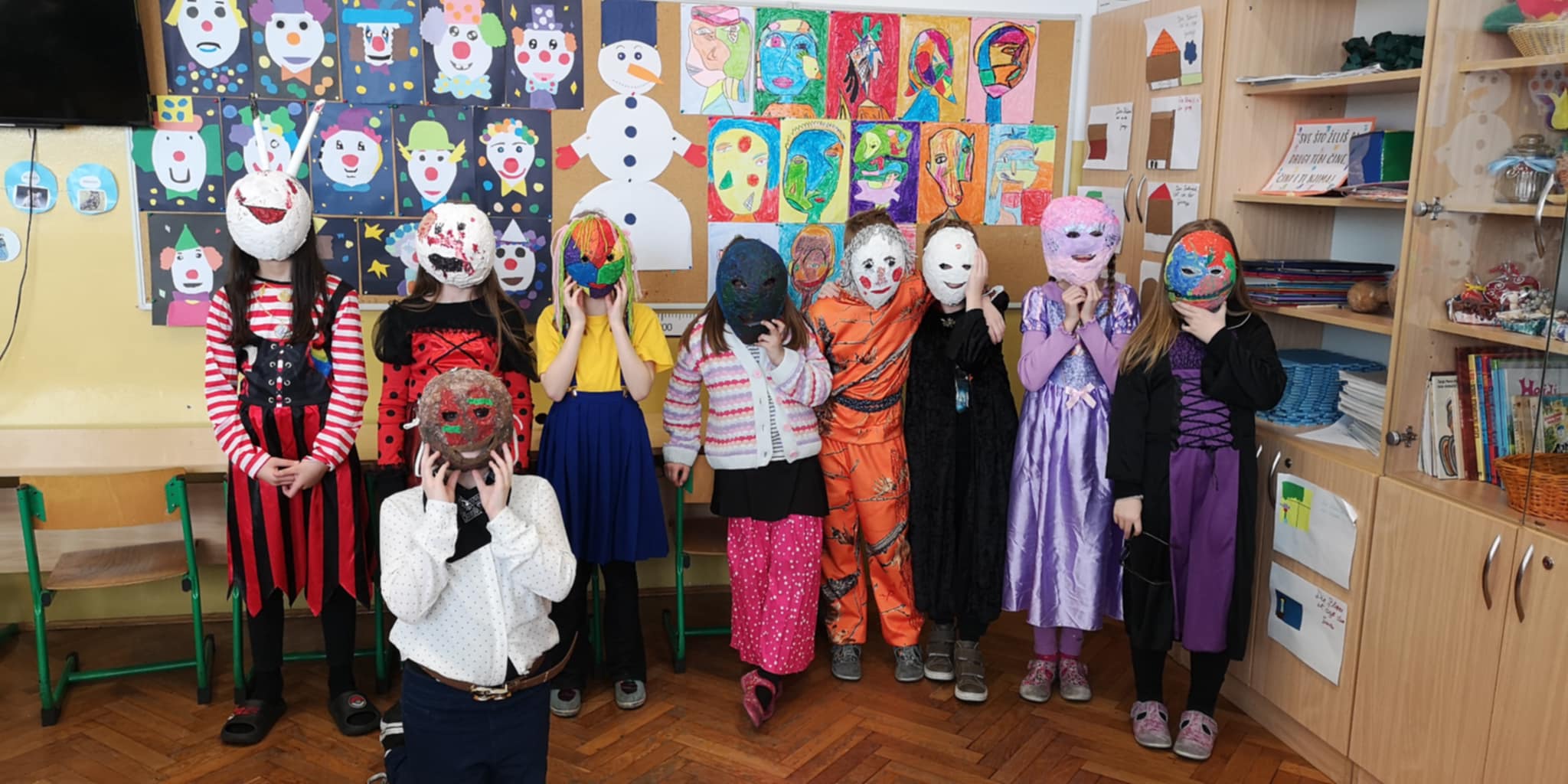 Učenici polaznici izvannastavne aktivnosti Domaćinstvo zajedno s učiteljicom Jasminkom Drabić okušali su se u izradi maski kaširanjem pa su ih tako unatrag tjedan dana izrađivali i danas, na sam Fašnik, dovršili.