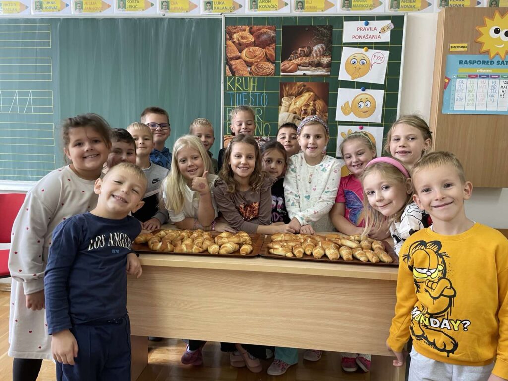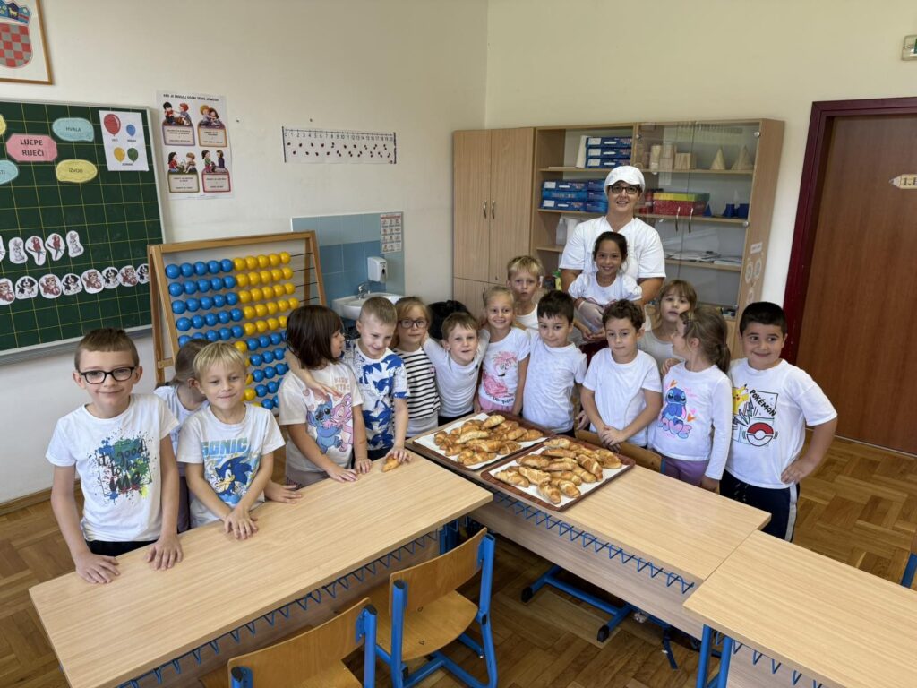 Ovaj tjedan u našoj školi slavimo Dan kruha i zahvalnosti za plodove zemlje, a za prvašiće 1. a i 1. b razreda bio je to tjedan pun mirisa, smijeha i učenja. Upoznali smo važnost kruha i blagovanja te otkrili put od zrna pšenice do ukusnog peciva. Posebne gošće bile su nam naše drage školske kuharice, koje su nam pokazale čaroliju izrade klipića. U suradnji s kuharicama, prvašići su zamijesili, oblikovali, premazivali i posipavali sjemenkama prave, male klipiće. Osim što smo vježbali motoriku i preciznost (što je super za male prstiće koji uče pisati), na praktičan smo način ponovili geometrijsko tijelo – valjak, geometrijski lik – trokut te niz prilikom oblikovanja klipića. Naučili smo što znači biti zahvalni za hranu koju imamo te osvijestili važnost zajedničkog rada i ljubavi kojom se stvara nešto ukusno. Nakon napornog „rada“, klipići su se ispekli, a nagrada je bila najslađa – sve smo ih s veseljem pojeli! Bilo je to iskustvo koje spaja učenje, zabavu i blagovanje. Hvala kuharicama Ružici i Kristini na strpljenju i znanju koje su podijelile s nama. (Janja F.)