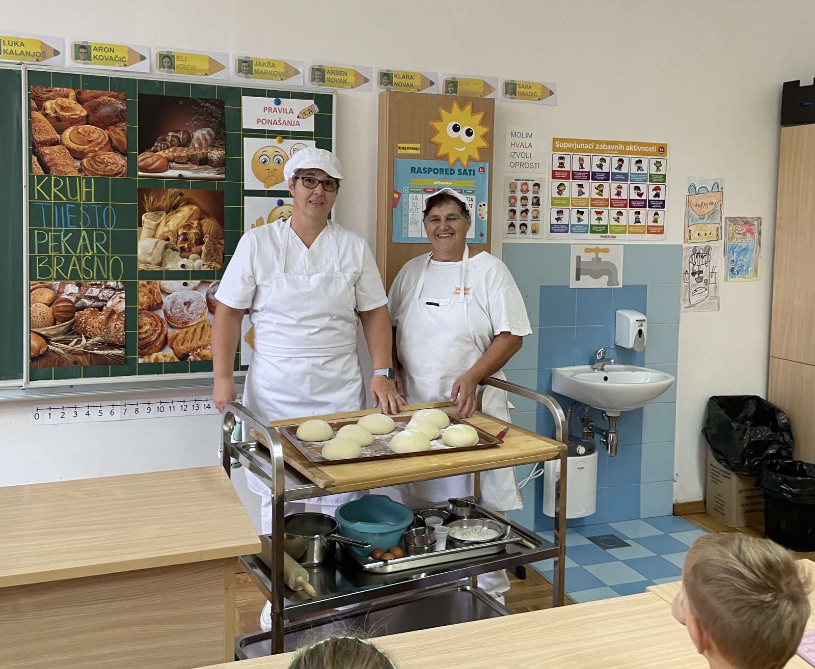 Ovaj tjedan u našoj školi slavimo Dan kruha i zahvalnosti za plodove zemlje, a za prvašiće 1. a i 1. b razreda bio je to tjedan pun mirisa, smijeha i učenja. Upoznali smo važnost kruha i blagovanja te otkrili put od zrna pšenice do ukusnog peciva. Posebne gošće bile su nam naše drage školske kuharice, koje su nam pokazale čaroliju izrade klipića. U suradnji s kuharicama, prvašići su zamijesili, oblikovali, premazivali i posipavali sjemenkama prave, male klipiće. Osim što smo vježbali motoriku i preciznost (što je super za male prstiće koji uče pisati), na praktičan smo način ponovili geometrijsko tijelo – valjak, geometrijski lik – trokut te niz prilikom oblikovanja klipića. Naučili smo što znači biti zahvalni za hranu koju imamo te osvijestili važnost zajedničkog rada i ljubavi kojom se stvara nešto ukusno. Nakon napornog „rada“, klipići su se ispekli, a nagrada je bila najslađa – sve smo ih s veseljem pojeli! Bilo je to iskustvo koje spaja učenje, zabavu i blagovanje. Hvala kuharicama Ružici i Kristini na strpljenju i znanju koje su podijelile s nama. (Janja F.)