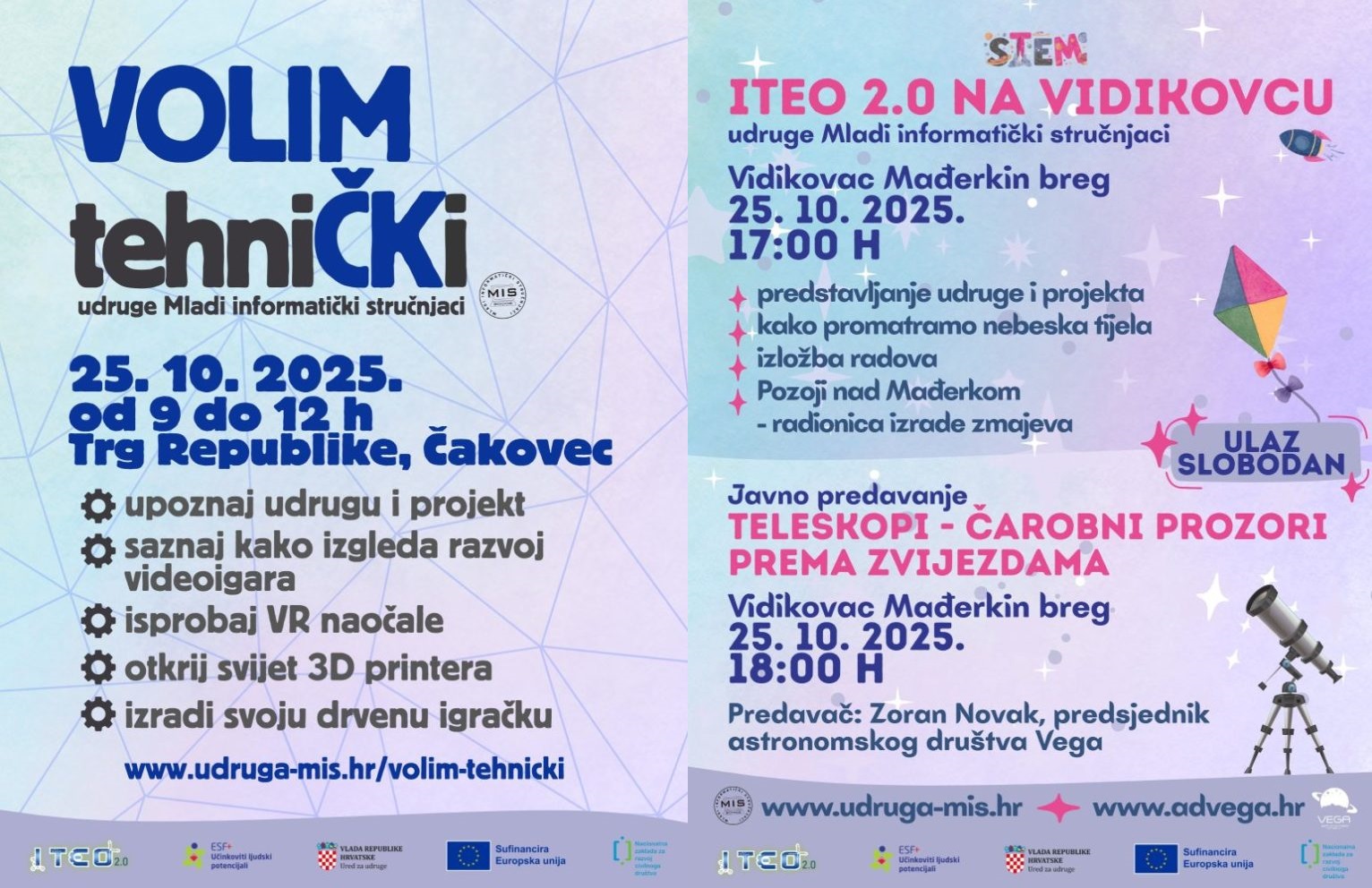 Kao vjernog partnera naših udruga te aktualnog partnera na projektu ITEO 2.0, srdačno Vas pozivamo na javne događaje VOLIM tehniČKi i ITEO 2.0 na vidikovcu koji će se održati 25. listopada 2025. VOLIM tehniČKi započinje u 9:00 h na Trgu republike u Čakovcu, dok ITEO 2.0 započinje u 17:00 h na vidikovcu Mađerkin breg.